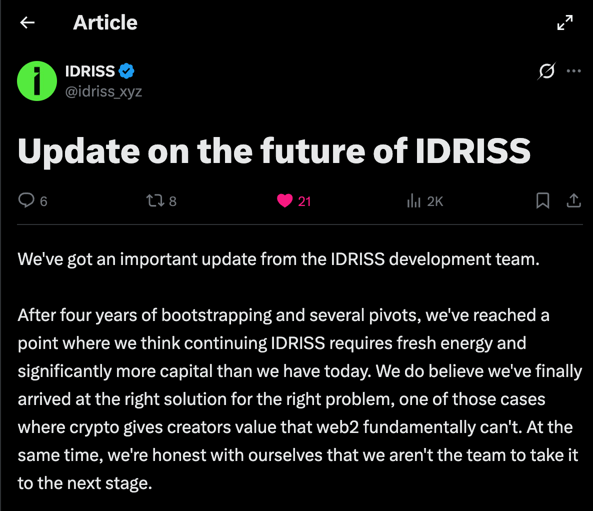 The team at IDRISS is looking for a new crew to take over the rudder. This is a massive chance to lead a well known project in the space. Do you know the right team, or are you the one to take over?
